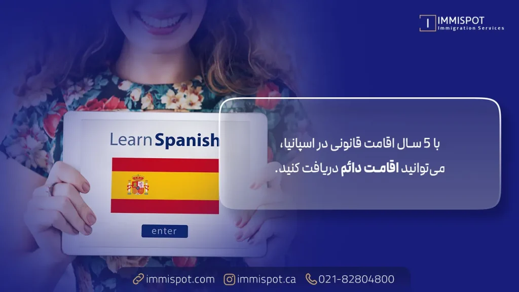 بر اساس قانون مهاجرت اسپانیا، هر فردی که پنج سال اقامت قانونی مستمر در این کشور داشته باشد، میتواند برای اقامت دائم (Residencia de Larga Duración) اقدام کند. این نوع اقامت حقوقی مشابه شهروندان اسپانیایی در زمینه کار، تحصیل و خدمات اجتماعی به فرد میدهد و معمولاً قابل تمدید نامحدود است.