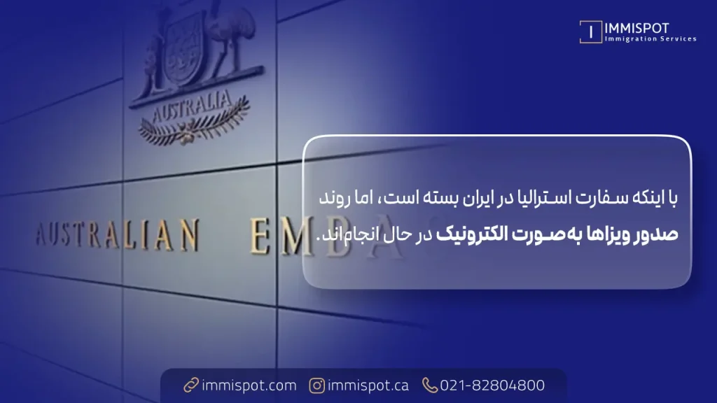 سفارت استرالیا در تهران برای امور کنسولی و بررسی ویزاهای دانشجویی و کاری درحال حاضر بسته است، اما پروندههای مهاجرتی با دلیل اینکه صدور ویزا به صورت الکترونیکی و در خارج از ایران است (از طریق سامانه ImmiAccount)، در حال انجاماند و برای انگشتنگاری، بدون رزرو وقت قبلی به کارگزاری VFS Globalمیتوانید مراجعه کنید.